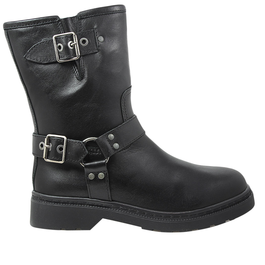 Steppari.fi:stä naisten biker-nilkkurit solkikoristeilla. Vetoketjukiinnitys helpottaa kenkien pukemista. Pitävä kumipohja.