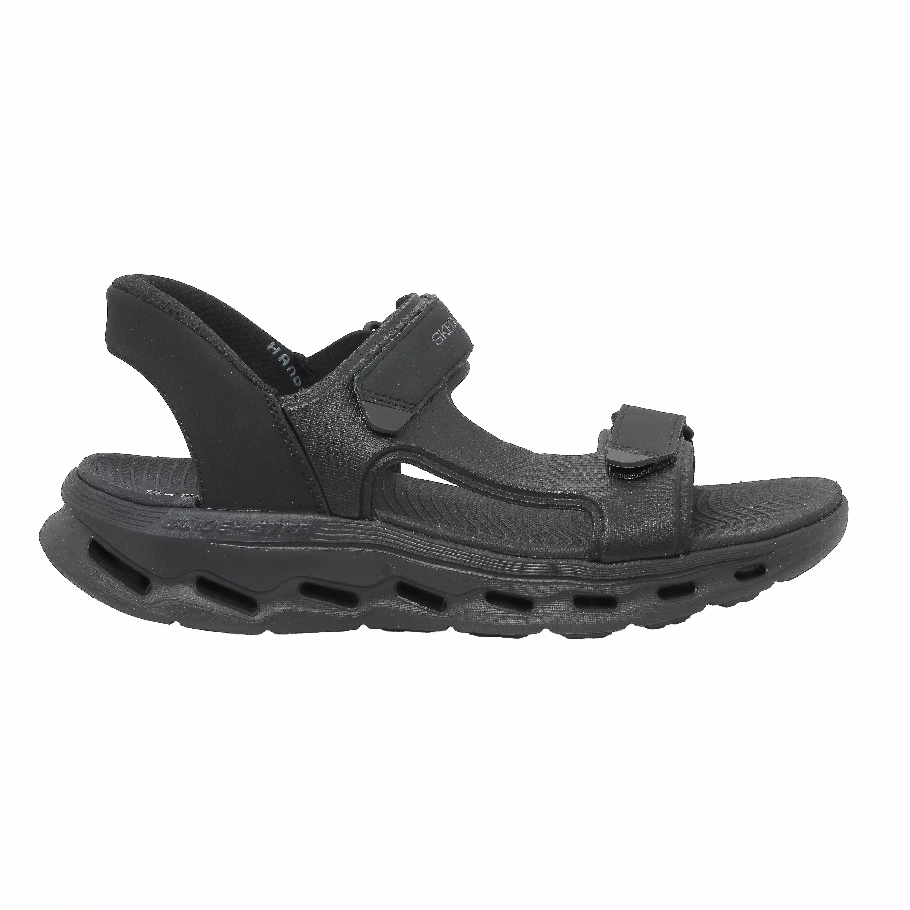 Steppari.fistä Skechers Hands Free Slip-ins®: GO WALK Glide-Step™ – Mar - miesten rennot sandaalit. Tässä slip-on-sandaalissa on synteettinen päällinen, jossa on säädettävät remmit jalkapöydän ja päkiän kohdalla, sekä Skechers Hands Free Slip-ins® -kantarakenne, joka on suunniteltu Heel Pillow® -ratkaisulla. Mallissa on kevyt ja responsiivinen ULTRA GO® -vaimennus sekä Glide-Step® -geometrinen, iskunvaimentava välipohja. Sisämitta 27,5 cm (koossa 43).