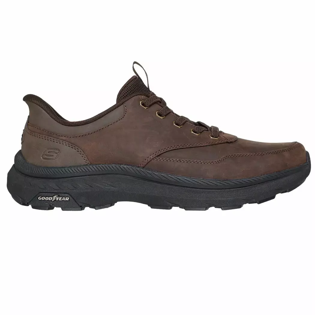 Steppari.fistä Skechers Hands Free Slip-ins® Relaxed Fit®Pollard - Brax ulkoiluun suunnitellut nauhalliset slip-in kengät. Kengissä on ainutlaatuinen Heel Pillow™, joka pitää jalan tukevasti paikallaan, sekä hiiltä sisältävä Skechers Air-Cooled Memory Foam® -sisäpohja, joka takaa pitkäkestoisen pehmeyden. Goodyear®-kumipohja varmistaa erinomaisen pidon, vakauden ja kestävyyden niin kuivissa kuin märissäkin olosuhteissa. Päällinen on nahkaa sekä keinonahkaa. Sisämitta 28 cm (koossa 43).