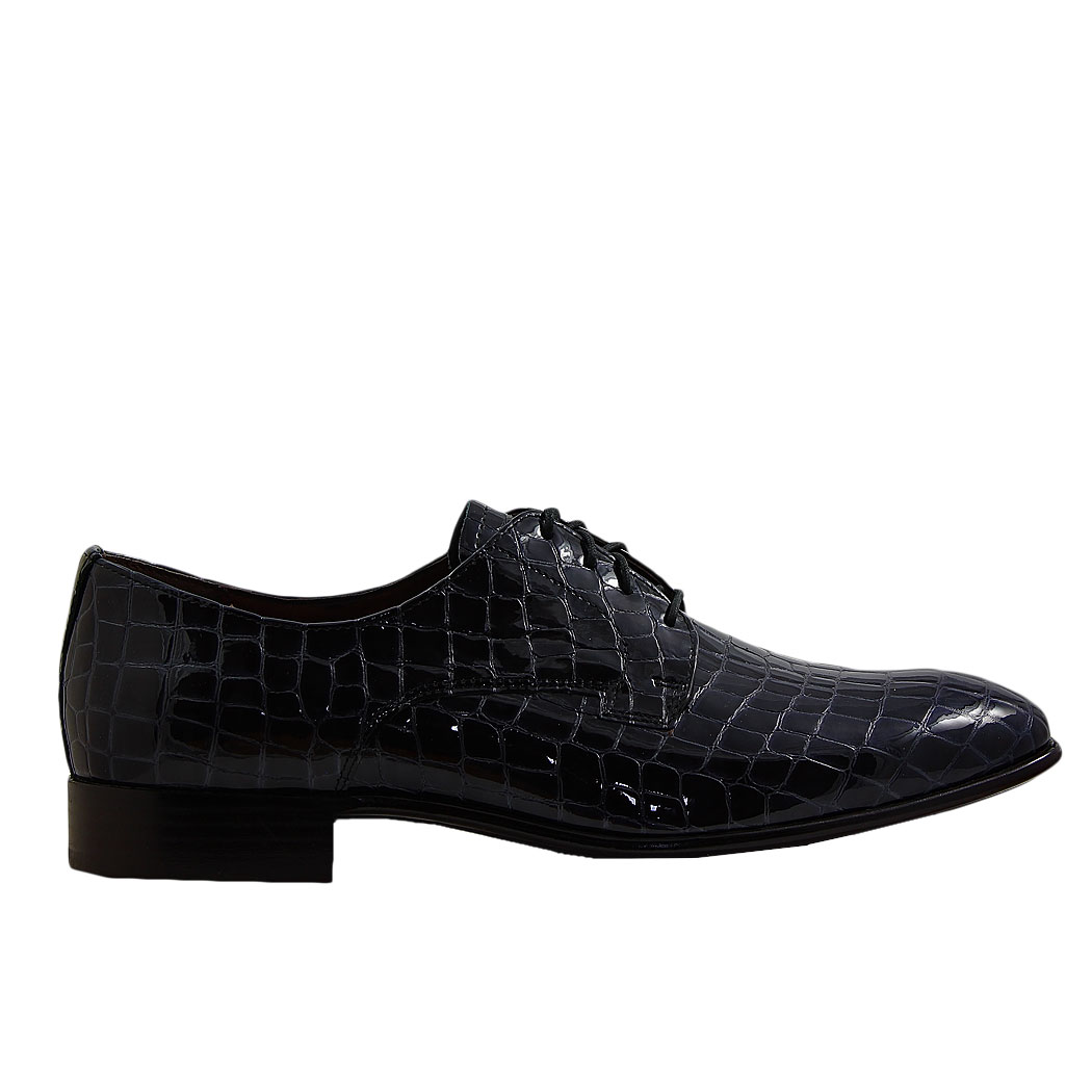 Steppari.fi:stä näyttävä sininen juhlakenkä, jossa lakeeripintainen krokokuviointi.