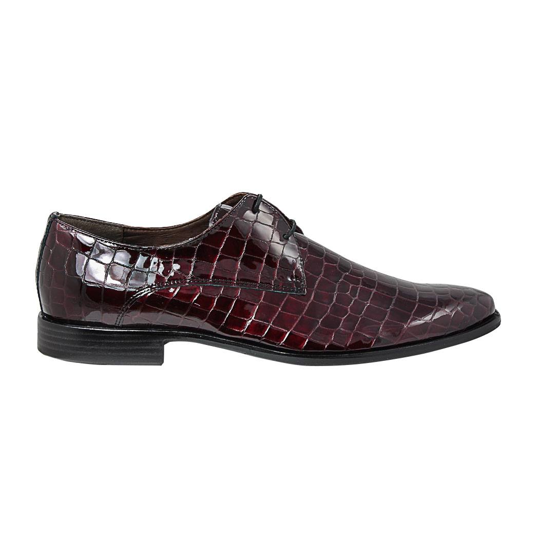 Steppari.fi:stä näyttävä viininpunainenjuhlakenkä, jossa lakeeripintainen krokokuviointi.