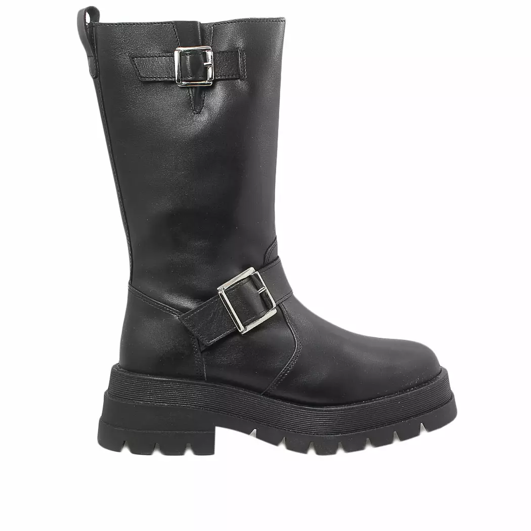Steppari.fi:stä naisten biker-nilkkurit, joissa on solkikoristeet ja vetoketjukiinnitys, joka helpottaa kenkien pukemista. Kenkien pitävyydestä huolehtii kumipohja. Varren korkeus n. 23,5 cm: Sisämitta 24,5 cm (koossa 38).